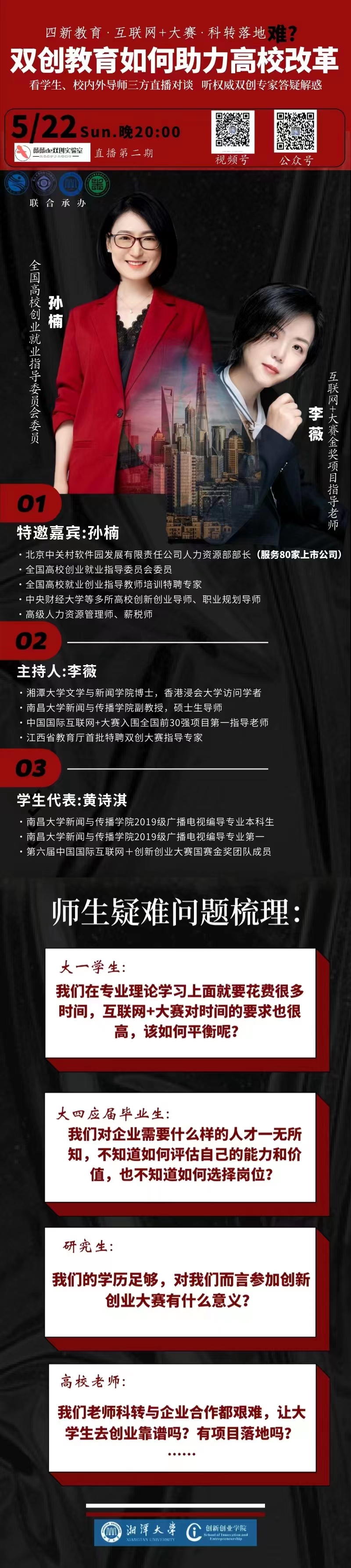 公司与南昌大学新闻与传播公司联合举办双创训练营系列活动--双创教育如何助力高校改革。本次活动重点梳理师生在创新创业大赛中的疑难问题,打造“升级版”的双创赛事,通过双创赛事促进双创教育改革。