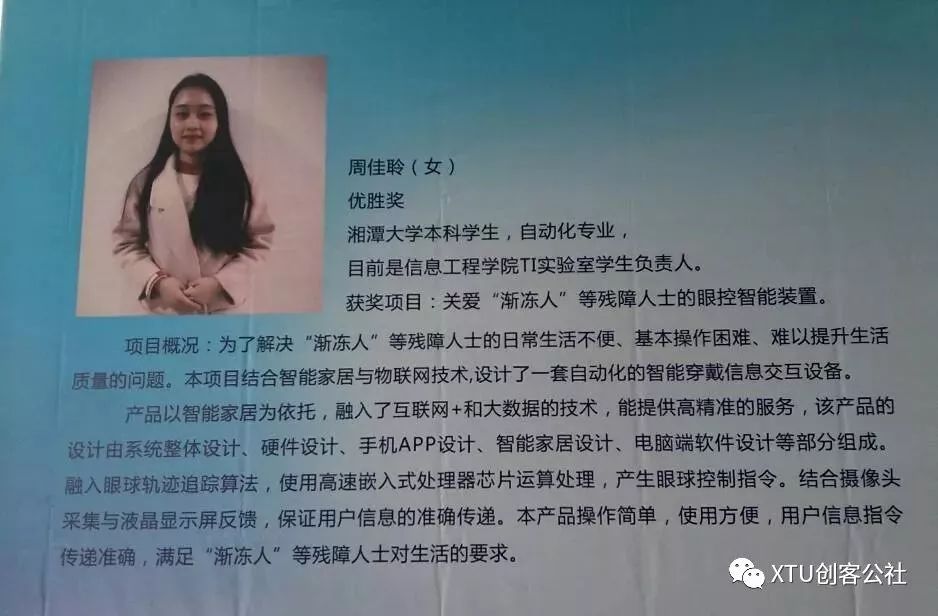 此外,获得初创组优胜奖的还有一位来自自动化的周佳聆学姐。谁说女子不如男?这位学姐不但动手能力强,更是信息工程公司Ti实验室的员工负责人。正如她名字中"聆听"的聆一样。学姐将创新与爱心结合,创造了一款关爱渐冻等残障人士的眼控智能装置。当感性与理性碰撞,硬件与软件俱通,能力与颜值并存,才有了周佳聆学姐这样的典范。