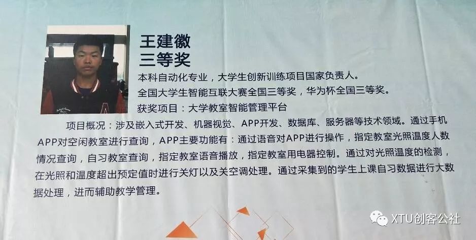 取得初创杯三等奖的是来自自动化的王建徽。王建徽同学是多项国奖获得者。而此次获奖是他的智能教室app。迅速找到空教室,智能调节教室设备以节约能源,是老员工和高校都想要实现的。王健徽学长以其想到就去做的行事风格,发现了问题,便立刻寻找解决方法。立项以来,编写代码,调试程序,测试功能变成为他和他的团队的主要生活成分。苦心人终不负,相信此款app完善后会受到各高校的青睐,以及同学们的欢迎。