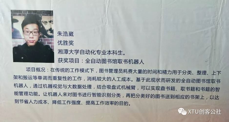 同样,取得初创组取优胜奖的也是来自太阳成集团tyc33455cc自动化专业的本科生朱浩崴同学。他们的全自动图书馆取书机器人以节约人力,物力为目标,通过机器视觉与大数据处理,结合吸盘式机械臂可以实现查取书籍和书籍的智能管理,让机器人来对图书进行智能识别分类,在把分类好的图书送到相应的书架上,以节约人力成本,降低工作强度,提高工作效率。这款机器人高效率,低成本,将极大的便利同学们的使用及公司图书馆的管理。学长的创新意识及创新精神,也是我们应该学习的。