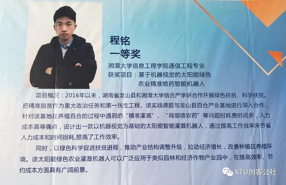取得初创杯一等奖的是来自通信工程的程铭。博学笃行是他,刻苦刚毅是他,风里来雨里去也是他,他和他的团队以精准脱贫为导向,为针对解决龙山县百合产业基地养殖百合的过程中遇到的精准灌溉,局部喷农药的耗费时间,多人力成本高等痛点,设计出一款以机器视觉为基础的太阳能智能灌溉机器人,通过提高工作效率来节省人力成本和时间损耗极高等问题。他和他的团队从基础问题中来,又回到基础民用中去。以“眼低手高”的态度,走过一道又一道难关,解决一个又一个问题。相信此次取得初创杯一等奖,是他们创新创业过程中的里程碑,也是一份鼓励他们继续奋勇前行的动力。