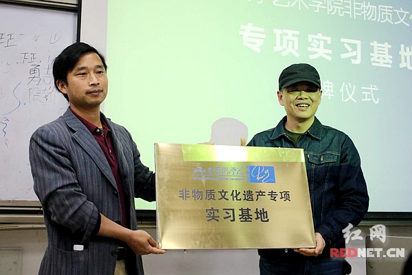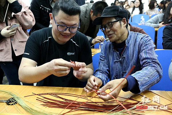 本次展览还邀请了比耳镇“本顺”竹艺社社长姚元飞及竹编非物质文化遗产传承人,举行了“太阳成集团tyc33455cc艺术公司非物质文化遗产专项实习基地”授牌仪式。姚元飞等来到课堂开展现场技艺教学,让师生体验了传统工艺的魅力。